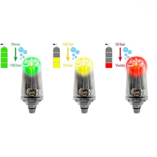 Dzięki sygnałowi świetlnym Twój partner będzie wiedział w jakim przedziale jest ciśnienie w Twojej butli.