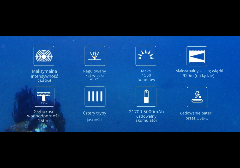 • Konstrukcja odporna na ciśnienie wody, głębokość do 150 metrów