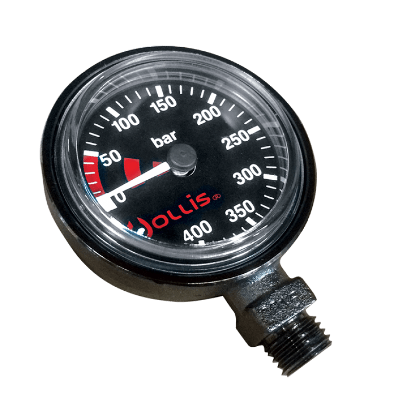 Niskoprofilowy, mosiężny manometr Hollis SPG ze skalą do 400 bar. Posiada odporną na zarysowania szybkę, czarne tło tarczy luminescencyjną wskazówkę.