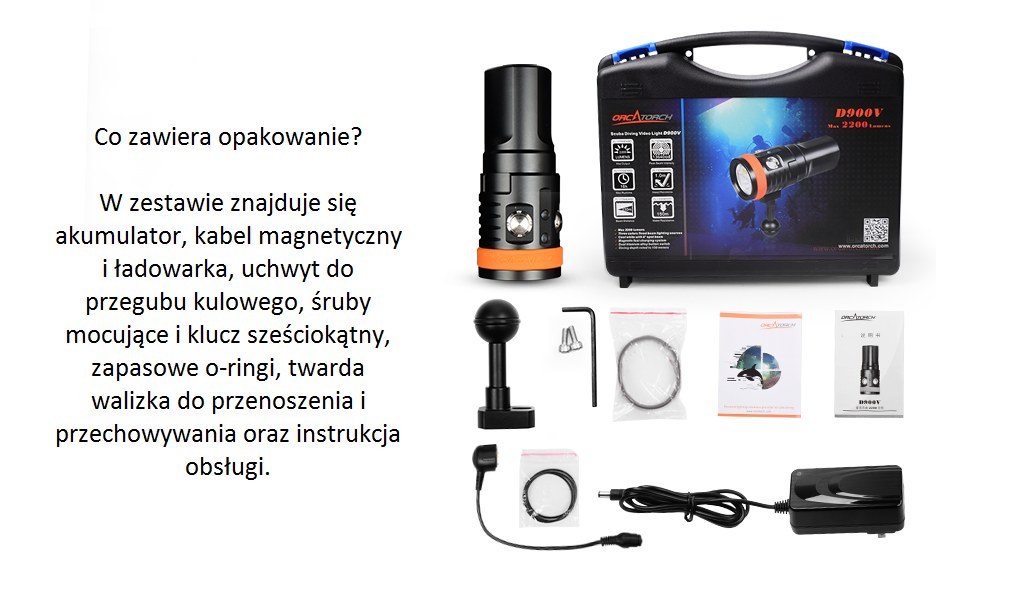 OrcaTorch D900V to latarka o mocy 2200 lumenów przeznaczona jako światło główne dla nurka oraz jako oświetlenie do kamery lub aparatu podwodnego. Posiada cztery typy świecenia: czerwony, UV, neutralny biały z szerokością wiązki 120° oraz zimna biel z wiązką punktową 8°. Dzięki pierwszej w branży technologii szybkiego ładowania magnetycznego latarkę można ładować bez wyjmowania baterii.