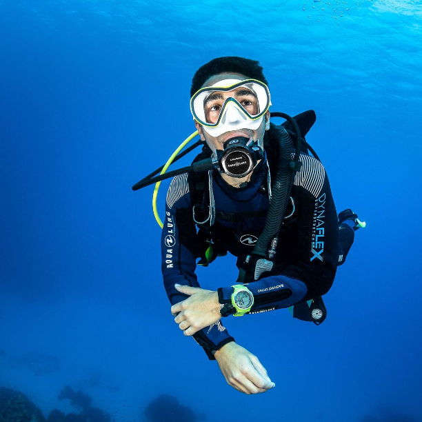 - Grafika nadrukowana na ramionach chroniąca skafander przed otarciami kompensatora pływalności.